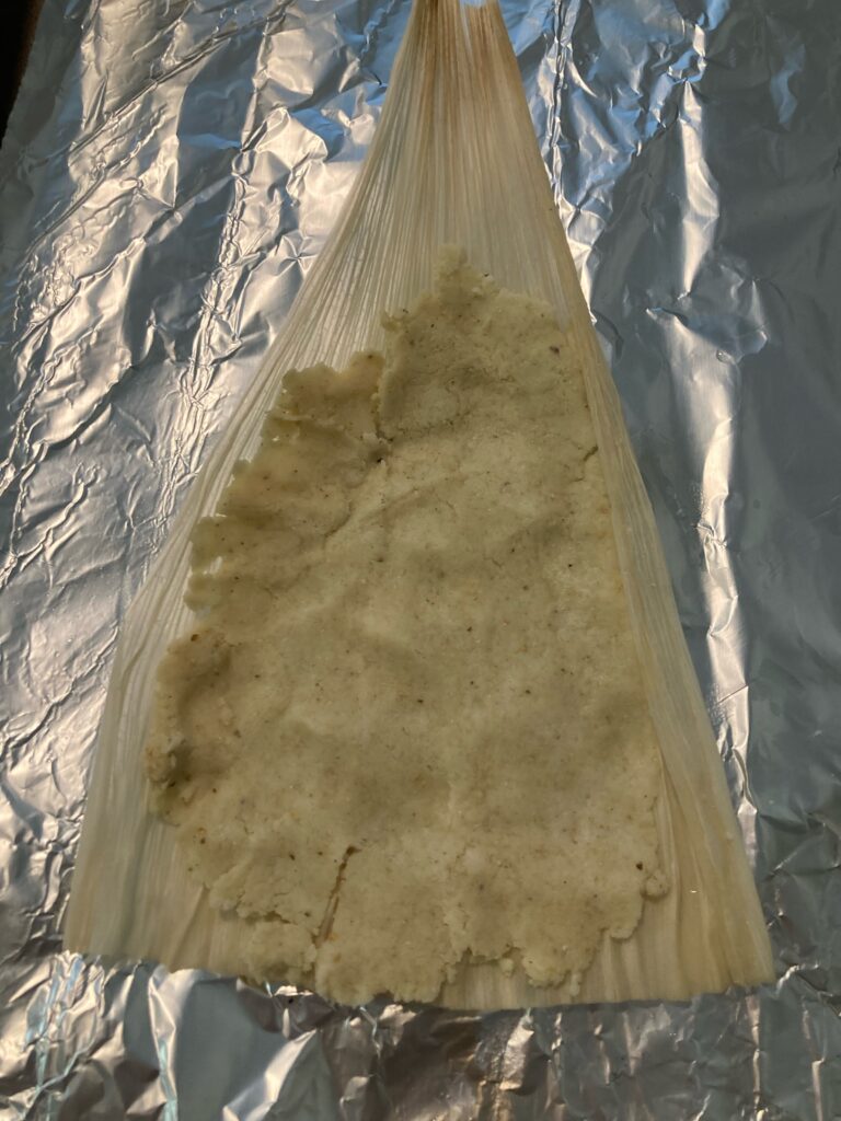 First, I grabbed a corn husk, spread some masa on it, leaving the top 1/3 empty since this would be folded over.
