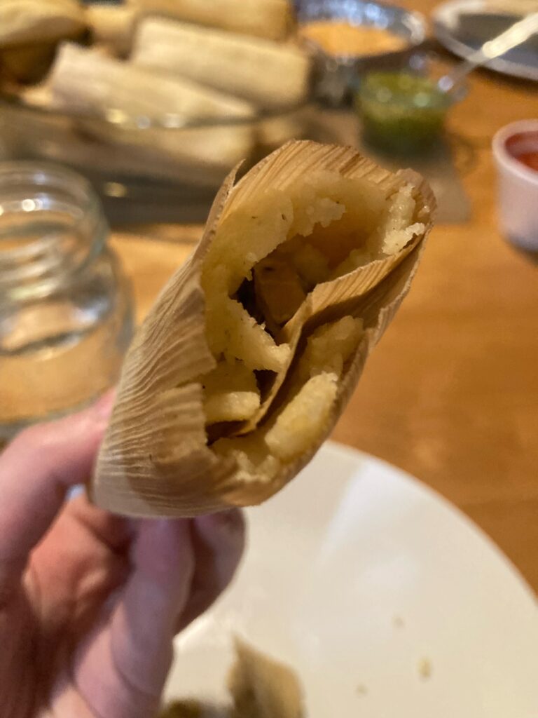 The tamales were supposed to steam for about 3.5 hours. However, in Isabel’s directions, it didn’t say anything about adding water to the bottom of the pot during the process. My mom and I started smelling something burning about 2 hours into the process and realized that all of the water in the pot had boiled off and the pot itself was burning. So, my mom scrubbed out the charred bits in the bottom of the pot and added more water and they continued steaming. So, my only criticism of Isabel’s recipe is that water should probably be added every hour of the tamal-steaming process, so keep this in mind if you try her recipe.