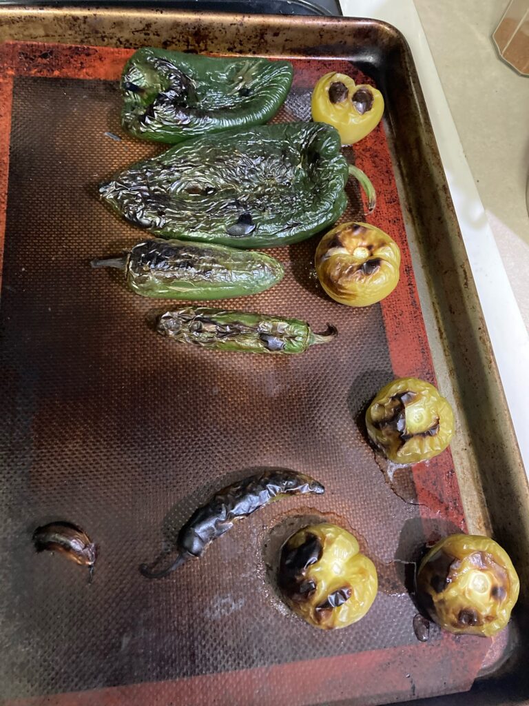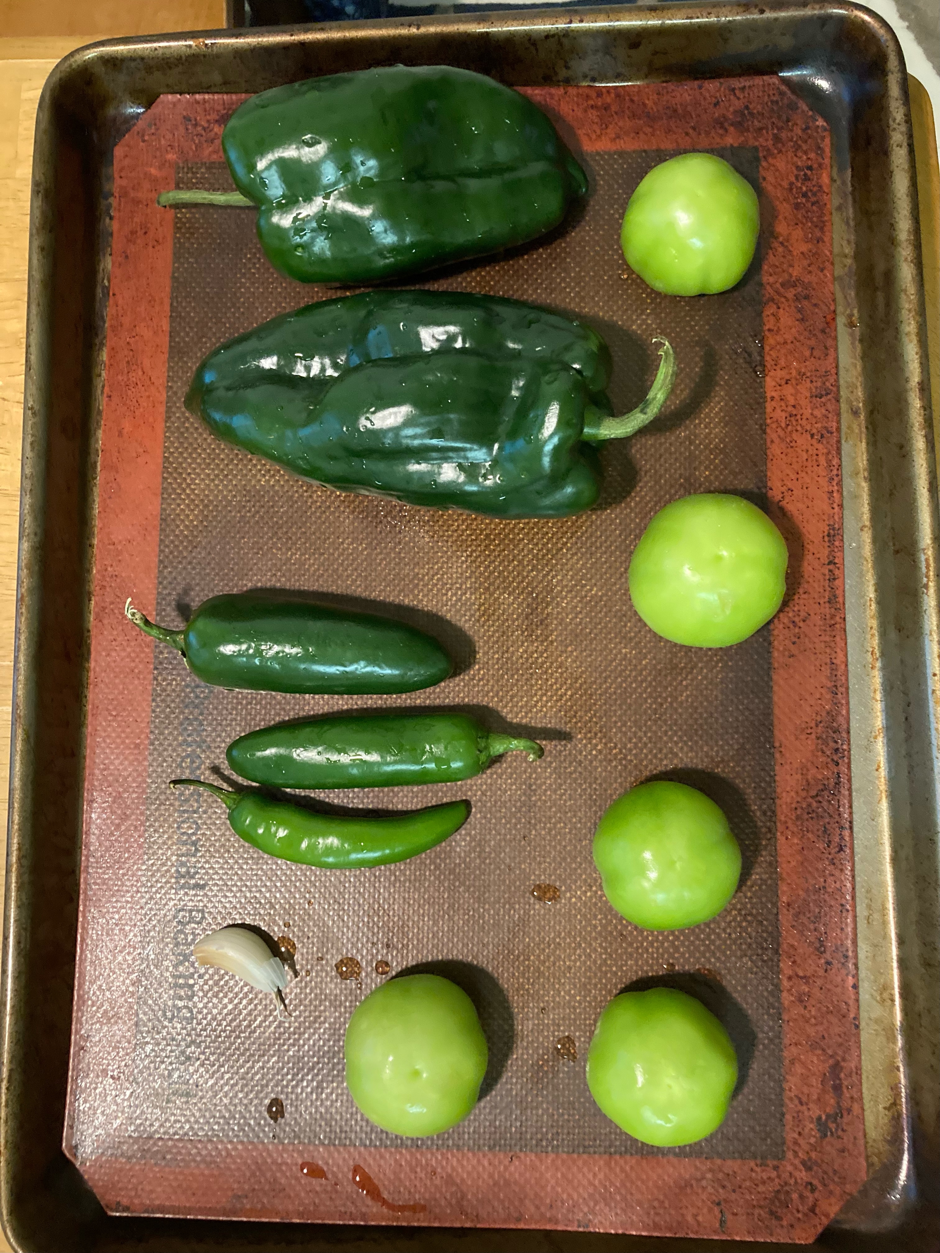 The corn husks sat in a pot with hot water for an hour, so while they were soaking, I proceeded to make the salsa verde. First, I placed 2 poblanos, a serrano, 2 jalapeƱos, a garlic clove, and tomatillos on a baking tray and put them under the broiler for about ten minutes.