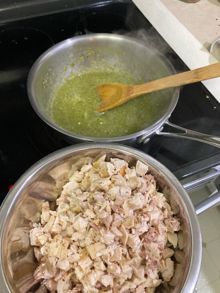 The next thing I did was I put some vegetable oil in a pan and then heated up my salsa verde mixture until it was boiling. At this point I added the cut up chicken to the sauce and allowed that to simmer while I prepared the masa dough.